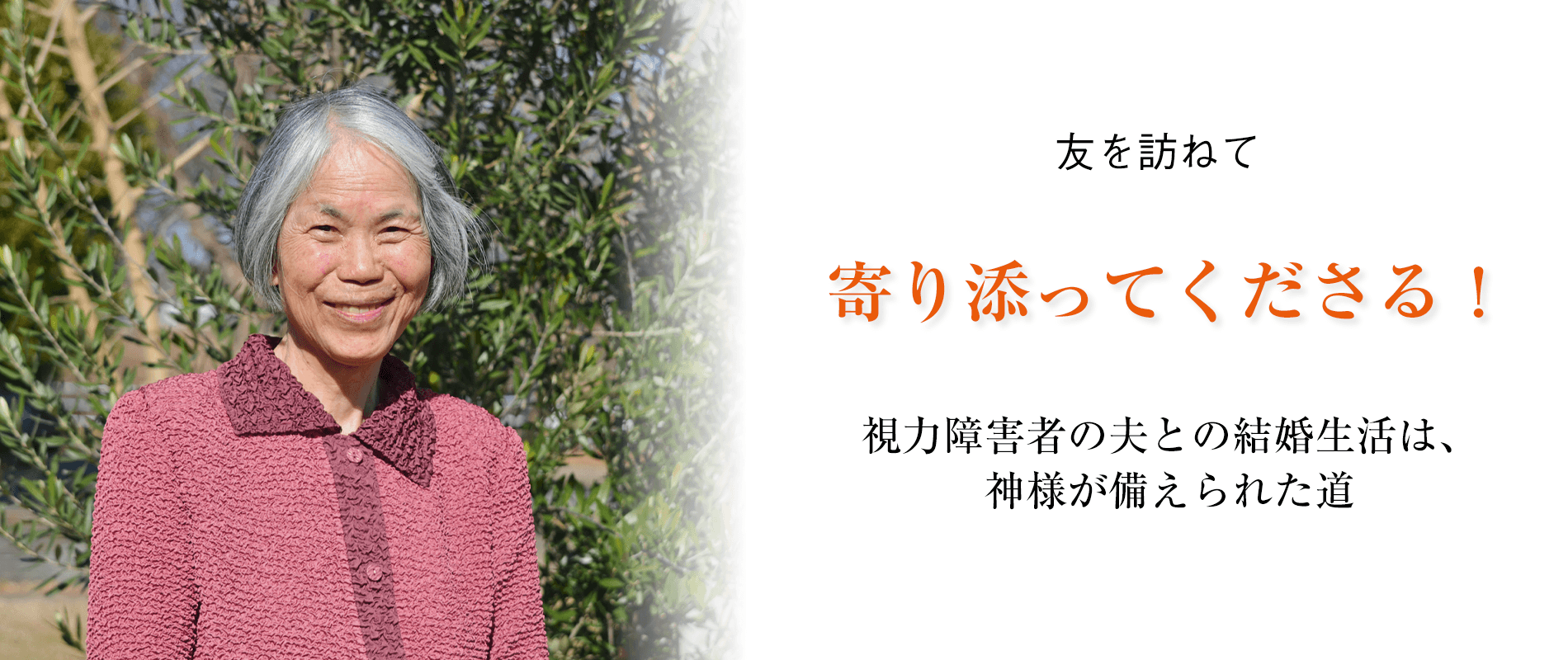 2026年4月13日 / 最終更新日時 : 2026年3月24日 Makuya-003 信仰の体験談、エッセイなど 友を訪ねて「寄り添ってくださる! ―視力障害者の夫と共に―」 40歳の時に視力障害のある方と出会い、結婚。覚悟していたけれど初めはその生活に戸惑い、主人の心に寄り添えていない自分だった。でもある時わかったんです、主人も私も神様に愛されている! と。
