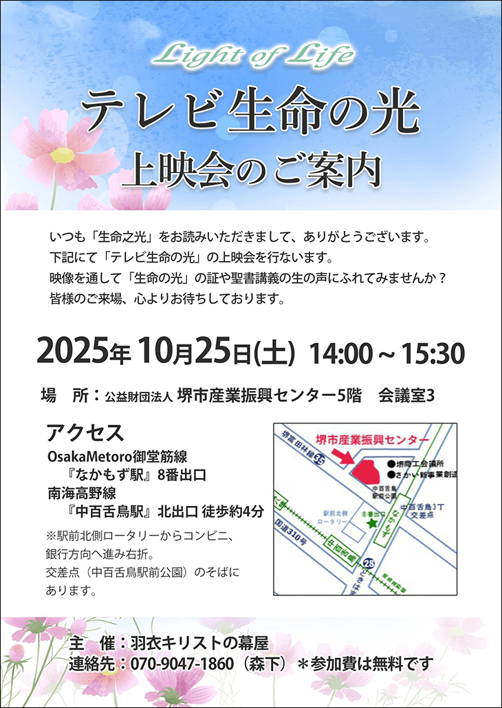 2025年7月9日 / 最終更新日時 : 2025年10月2日 Makuya-003 上映会のご案内 2025年10月25日(土)テレビ『生命の光』上映会 時 間開場:14:00(無料)会 場堺市産業復興センター 5階 会議室3(大阪府堺市北区長曽根町183-5)連絡先森下偉作矢(TEL:070-9047-1860) FacebookX