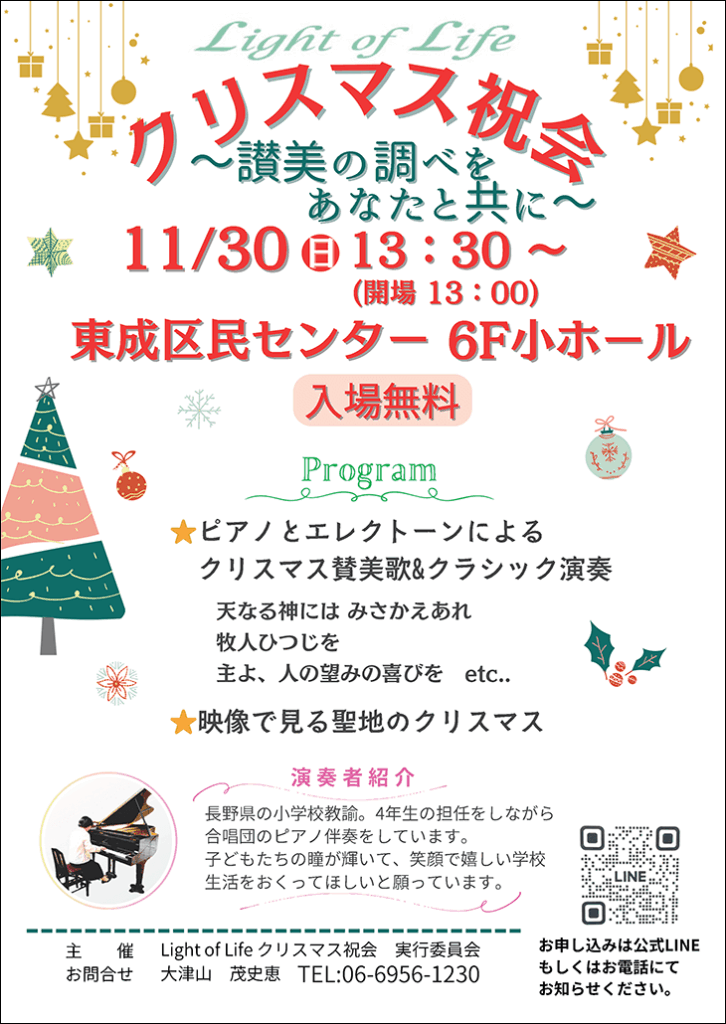 2025年7月6日 / 最終更新日時 : 2025年11月7日 Makuya-003 イベントのご案内 2025年11月30日(日)Light of Life クリスマス祝会 歌や映像と共にうれしいクリスマスをご一緒に迎えましょう。どうぞお気軽にお越しください。 時 間13:30~(入場無料)会 場東成区民センター 6F「小ホール」(大阪市東成区大今里西3-2-17)連絡先大津山 茂史恵(TEL:06-6956-1230) FacebookX
