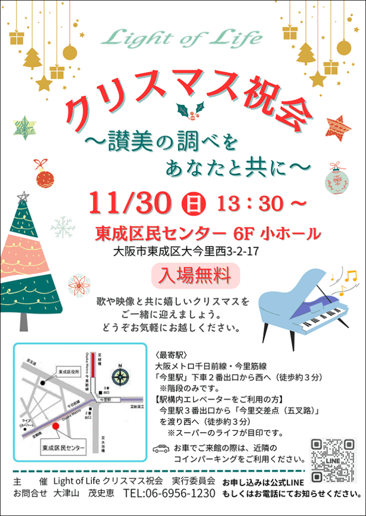 2025年7月6日 / 最終更新日時 : 2025年10月8日 Makuya-003 イベントのご案内 2025年11月30日(日)Light of Life クリスマス祝会 歌や映像と共に嬉しいクリスマスをご一緒に迎えましょう。どうぞお気軽にお越しください。 時 間13:30~(入場無料)会 場東成区民センター 6F「小ホール」(大阪市東成区大今里西3-2-17)連絡先大津山 茂史恵(TEL:06-6956-1230) FacebookX
