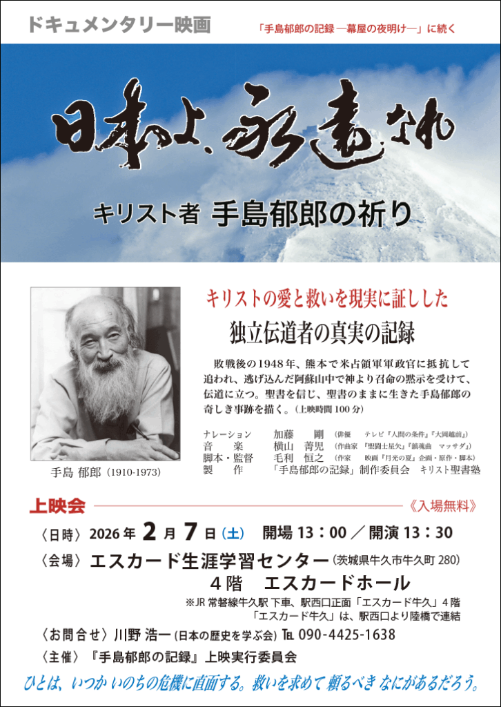 2026年1月3日 / 最終更新日時 : 2026年1月5日 Makuya-003 上映会のご案内 2026年2月7日(土)映画『日本よ、永遠なれ』上映会 時 間開場:13:00 上映:13:30(無料)会 場エスカード生涯学習センター 4階「エスカードホール」(茨城県牛久市牛久町280)連絡先川野浩一(TEL:090-4425-1638) (上映時間100分) FacebookX